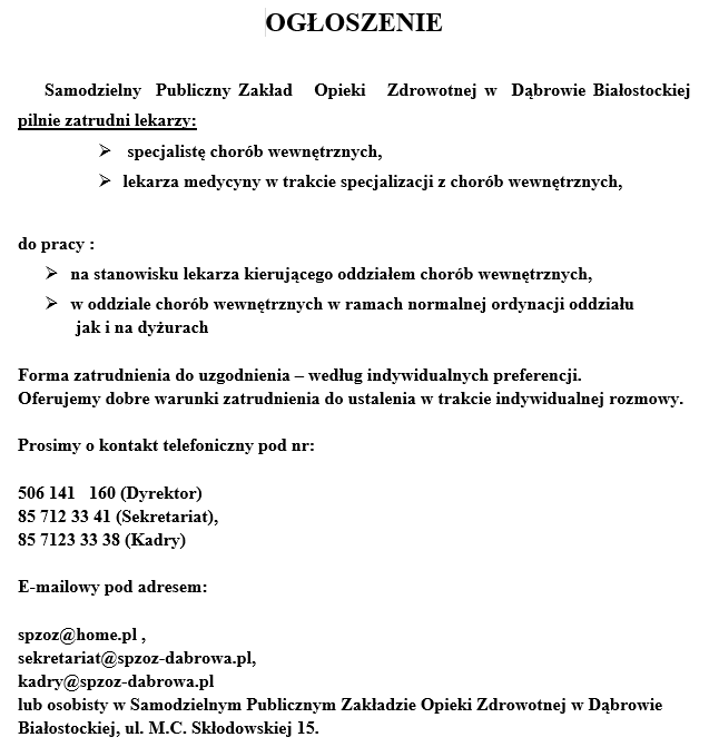Samodzielny Publiczny Zak³ad Opieki Zdrowotnej w D¹browie Bia³ostockiej pilnie zatrudni lekarza specjalistê medycyny rodzinnej lub chorób wewnêtrznych do pracy w Przychodni Rejonowej w Suchowoli w charakterze lekarza Podstawowej Opieki Zdrowotnej, oraz specjalistê psychiatrê do pracy w Poradni Zdrowia Psychicznego i Poradni Leczenia Uzale¿nieñ w D¹browie Bia³ostockiej.