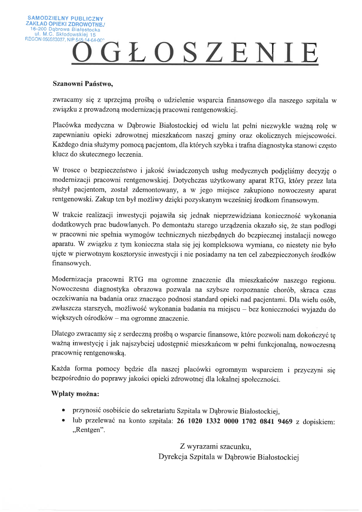 Samodzielny Publiczny Zak³ad Opieki Zdrowotnej w D¹browie Bia³ostockiej informuje, i¿ termin wznowienia pracy Pracowni Rentgenowskiej nast¹pi prawdopodobnie z pocz¹tkiem kwietnia 2026r.