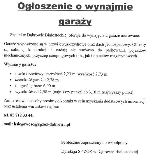 Forma, warunki pracy i p³acy do indywidualnego uzgodnienia z Dyrektorem w Samodzielnym Publicznym Zak³adzie Opieki Zdrowotnej w D¹browie Bia³ostockiej